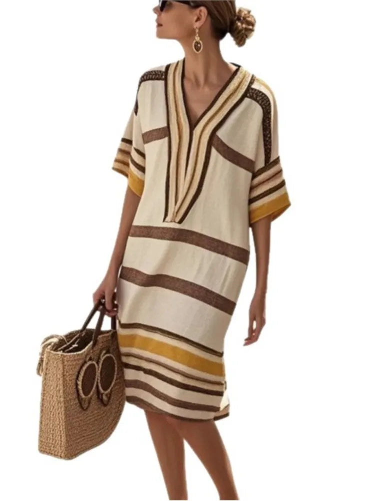 Elea - Casual Striped Print Loose Dress Half Sleeved V Neck Midi Dress