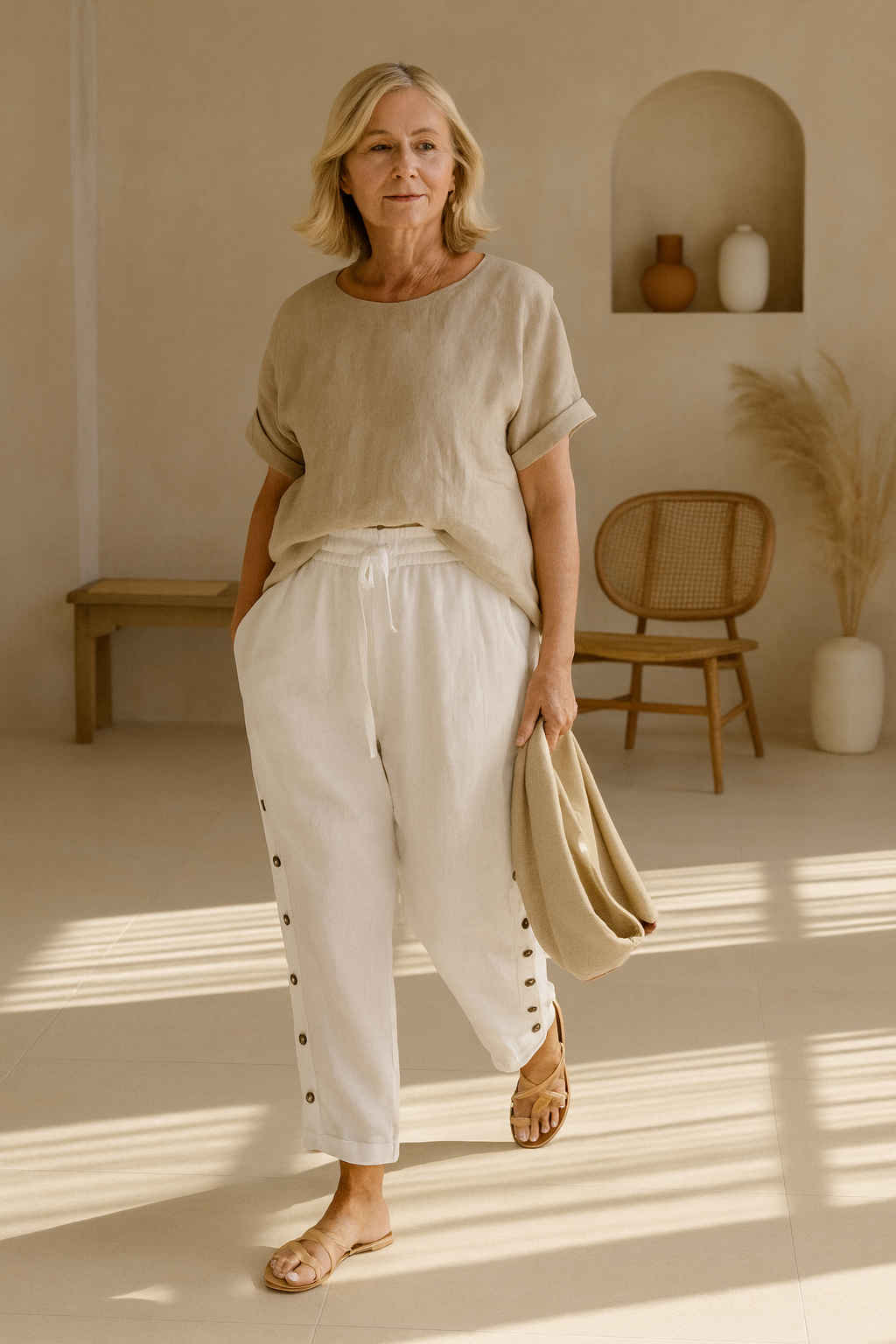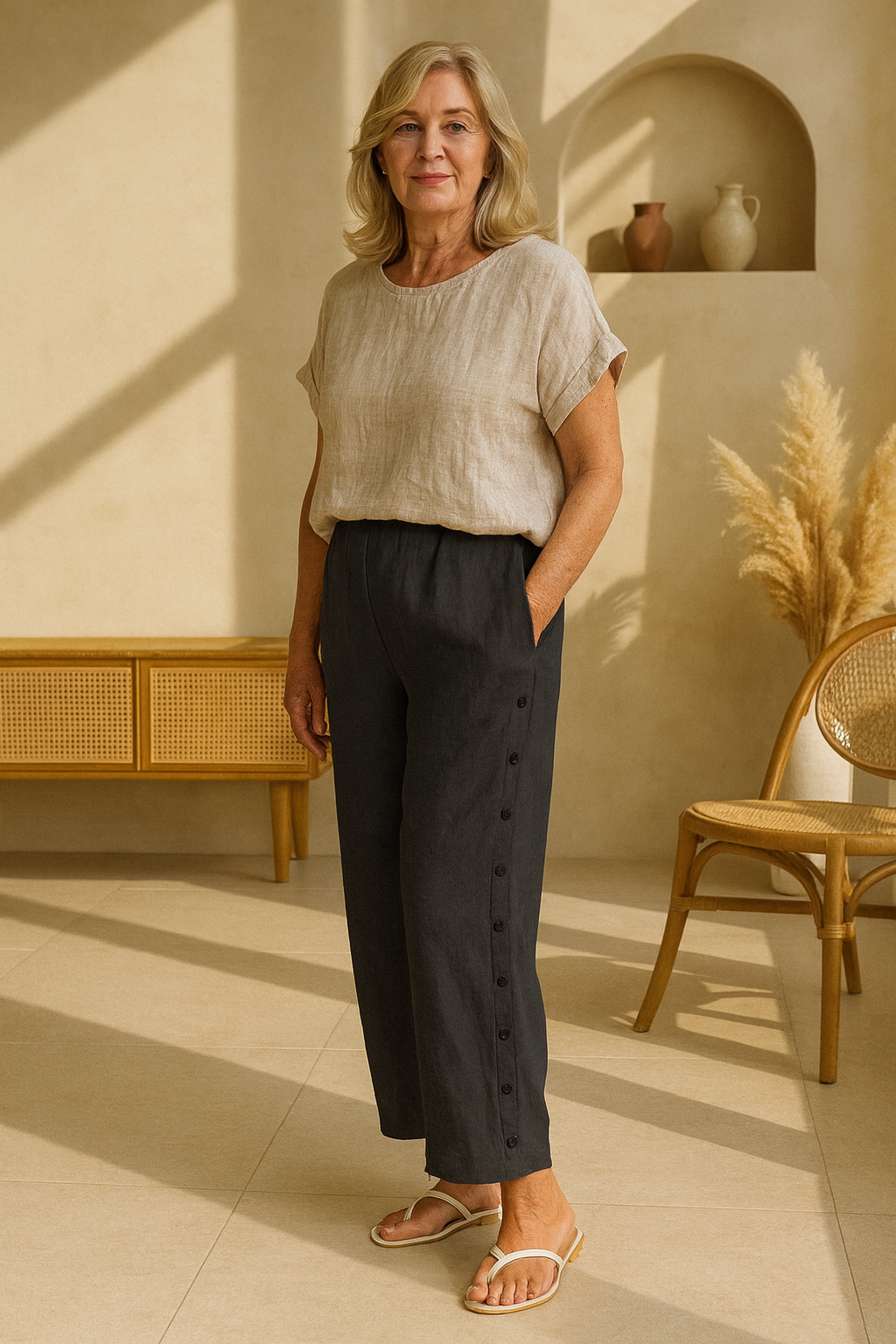 The Amari - Classic Button Pants bring together structure and breeziness in a timeless design. Featuring bold side-button details and a relaxed tapered leg, they’re your effortless go-to for laid-back weekends or creative errands.